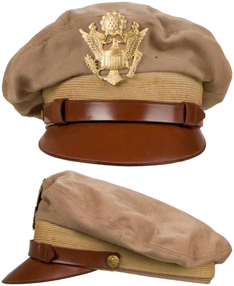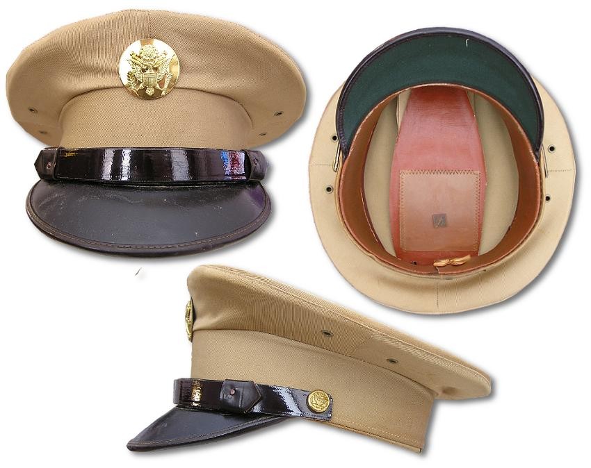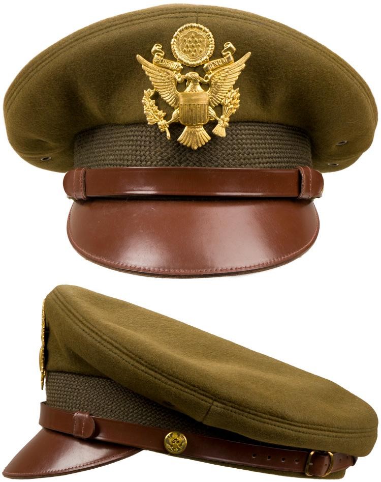 军官大檐帽的颜色为OD 51,帽墙为格子纹路布料制成。帽檐和下巴带用赤褐色皮革制成,下巴带用两颗金色纽扣固定在帽墙左右两侧。帽檐正面是硕大的金属美国国徽。军官夏季常服也有相应的卡其色帽盖的大檐帽。