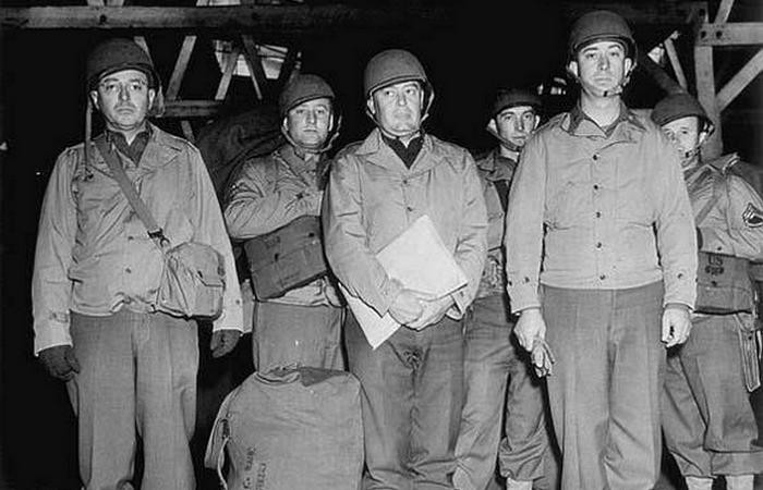 下图从左到右:陆军准将杰西·奥顿(Jesse Auton),驻欧洲盟军最高司令陆军上将德怀特·艾森豪威尔(Dwight D. Eisenhower),驻欧洲美国战略空军司令陆军中将卡尔·斯帕茨(Carl Andrew Spaatz),欧洲和太平洋第8航空队司令陆军中将詹姆斯-杜立特(James Doolittle),第8航空队第2 轰炸机师师长陆军中将威廉·凯普纳(Donald M. Blakeslee),陆军上校唐纳德·布莱克斯利(Donald M. Blakeslee)。