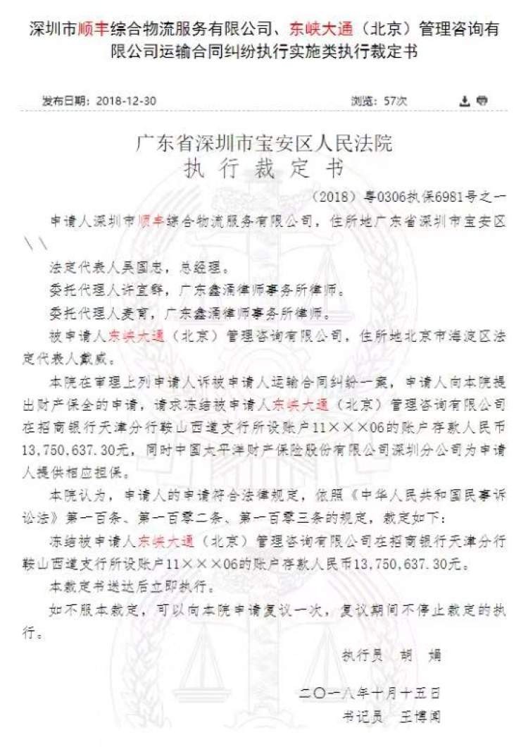 依据中国裁判文书网信息显示,2018年12月30日,广东省深圳市宝安区人民法院裁定,顺丰在运输合同纠纷一案中提出的财产保全申请符合法律规定,冻结东峡大通(ofo的运营主体)在招商银行天津分行鞍山西道支行所设账户存款13,750,637.30元。