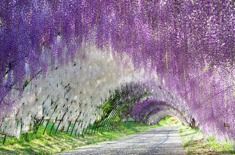 坐落于日本福冈县北九州市的河内藤园中,每年的樱花季节过后,随之到来的是紫藤花,每年的4月至5月是观赏紫藤隧道的最佳时间。