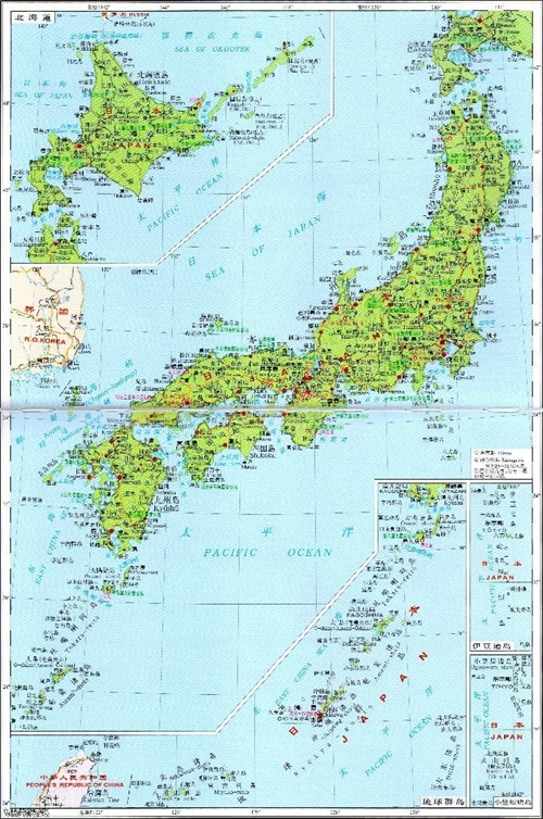 日本:东亚岛国,国土包括北海道、本州、四国、 九州四大岛和3000余个小岛,面积37.8平方公里。人口 1.26亿,几乎全为大和民族。首都东京。山地、丘 陵占3/4,余为平原、低地和台地。多火山、地震。海岸曲折, 多天然良港。矿藏贫乏。温带海洋性季风气候。