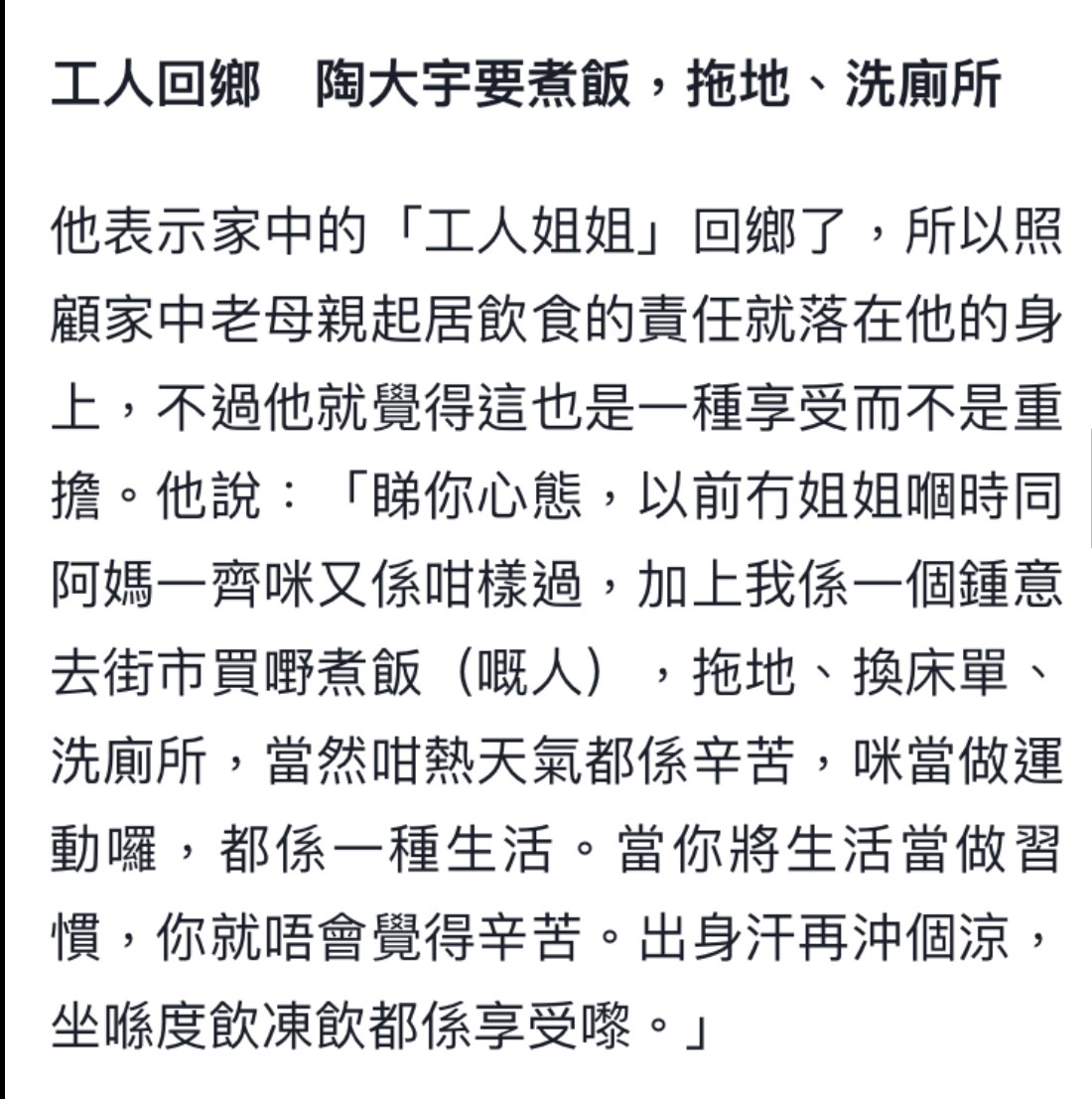 虽然以内地为工作的大本营,但是陶大宇并不少在香港生活,主要是为了陪伴以及照顾92岁高龄的母亲。陶大宇是圈内出名的孝子,不管是从前还是如今,他所做的一切都是以母亲作为考虑,就比如他在内地与香港两边跑,其实是非常辛苦的,实际上他完全可以长居在内地,但是考虑母亲年纪大了,他还是愿意不辞劳苦。陶大宇自曝,由于照顾母亲的保姆已经回乡了,所以如今照顾母亲起居的重责就落在他身上,虽然会比较辛苦,但是他也觉得这是一种享受。只能说陶大宇的心态很好,他坦言从前没有保姆,自己与母亲也是这么过,拖地、洗厕所、换床单,都是亲力亲为,还亲自到街上买菜回家做饭。