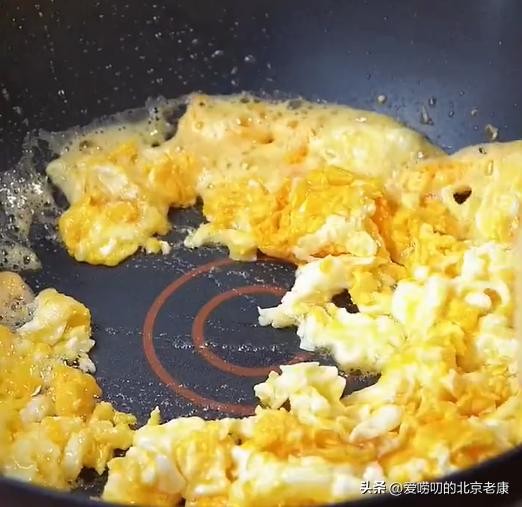首先,热锅烧油,油热放入打好的鸡蛋,把鸡蛋炒熟炒散盛出备用