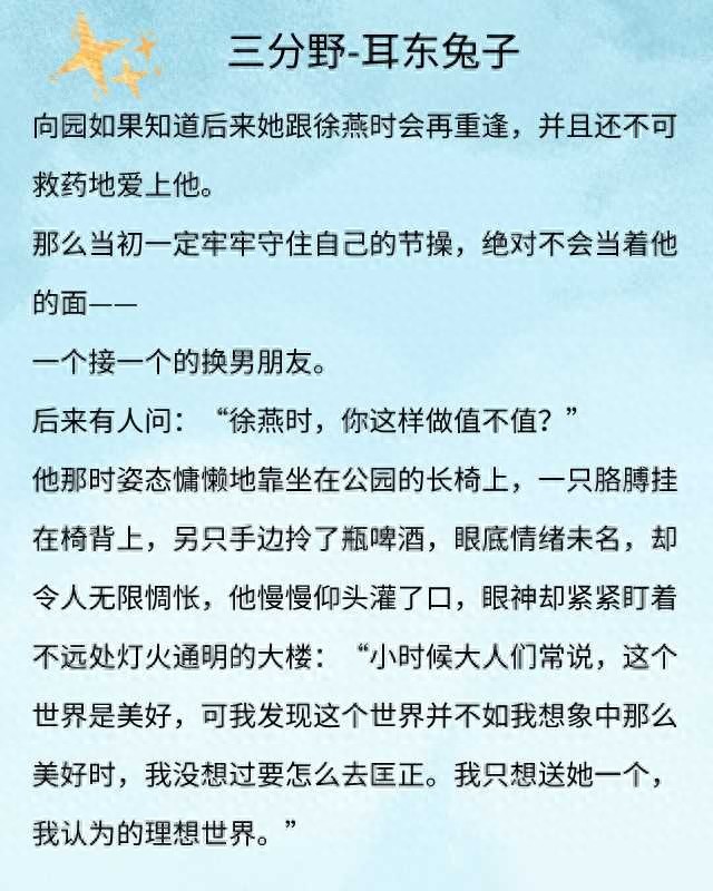 1、《三分野》-耳东兔子《三分野》中向园与徐燕时的故事,以高中同学为背景,让人感受到时光流转中青涩的爱情。徐燕时在向园生活中的种种经历,无疑为这段重逢的故事增色不少。与此同时,徐燕时在职场上的经验也成为向园成为女总裁的支撑力量,呈现出一种职场爱情的别样韵味。