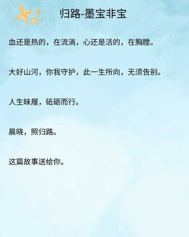 4、《归路》-墨宝非宝《归路》以归晓与路炎晨的军婚故事为主线,讲述了两人因为工作原因分开多年后的重逢。这一情节在现实中常见,也让读者更容易产生共鸣。军婚的不易,物是人非的情感冲击,使整个故事充满了战胜困难的勇气,吸引着读者一探究竟。