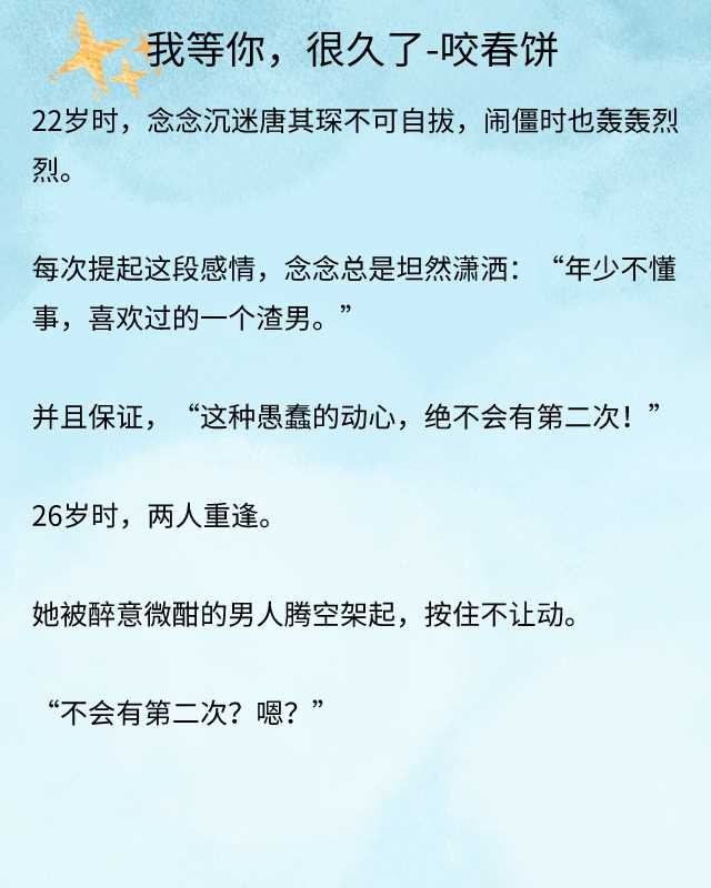 2、《我等你,很久了》-咬春饼《我等你,很久了》以唐其琛与温以宁的故事为主,通过大总裁与普通大学生的跨越时空的恋情,将读者带入一场跌宕起伏的感情旋涡。温以宁的误会和离去,以及多年后的重逢,使整个故事情感更加丰富。这样跨越年龄差距的恋爱故事,也引发了很多读者对于爱情的深思。