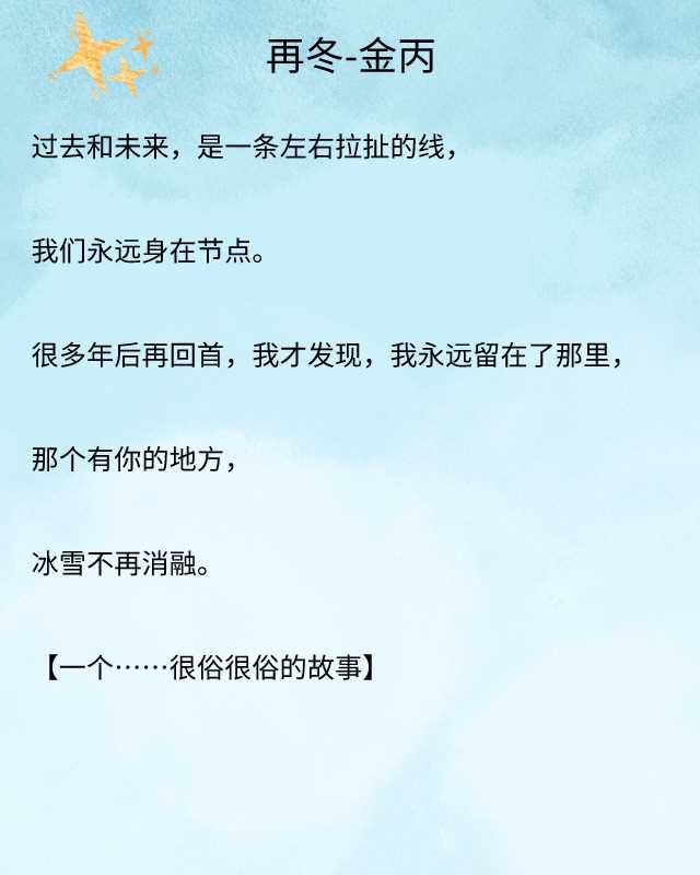 3、《再冬》-金丙《再冬》中喻见与孟冬的青梅竹马的爱情故事,借助一次假装失忆的机会,重新展开的爱情引人入胜。通过倒叙的叙事方式,揭示两人过去的点滴,增加了故事的层次感。这样的处理方式不仅让读者更好地理解主人公的情感经历,也为整个故事注入了一份神秘感。