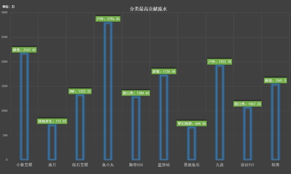 分析十家公会近三十天分类最高贡献流水,总流水排行第四名的鱼小丸,仅户外流水就高达2796万,九途户外流水也直逼两千万。渝万与炫石两家公会,一家有着绝地求生一姐一条小团团,一家则由DNF一哥投资,因此流水贡献最高也分别为这两类。YY两大公会均为脱口秀分类贡献流水最高。