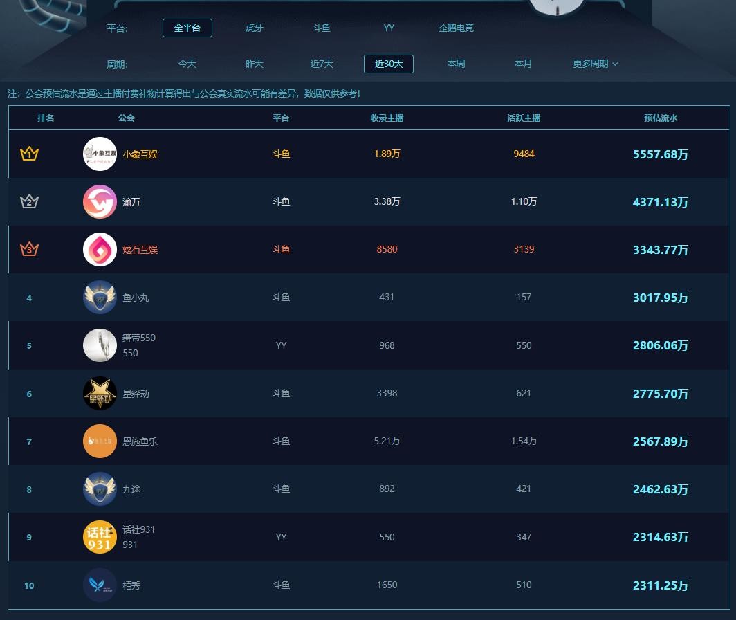 得益于斗鱼平台近期推出的粉丝团与魔法彩蛋活动的风靡,近三十天全网公会流水排行榜中,八大公会均来自于斗鱼平台,其中囊括主打游戏、颜值、户外,覆盖面广。其中小象互娱与渝万两家公会已经多期蝉联流水收入前两位,YY两大公会舞帝与话社同样是前十名流水霸主。