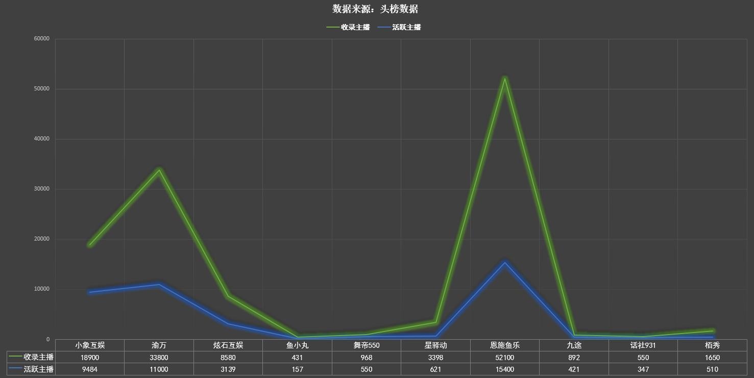 目前十大公会中收录主播最多的是恩施鱼乐,共计超过五万多名主播。活跃率对比最高的则是第一名的小象互娱,接近两万名主播在册,主播近三十天活跃率依然能够超过五成。此外鱼小丸、九途、舞帝这三家公司属于平台主播个人创建,收录主播虽少,但吸金力完全不输专业公会平台。