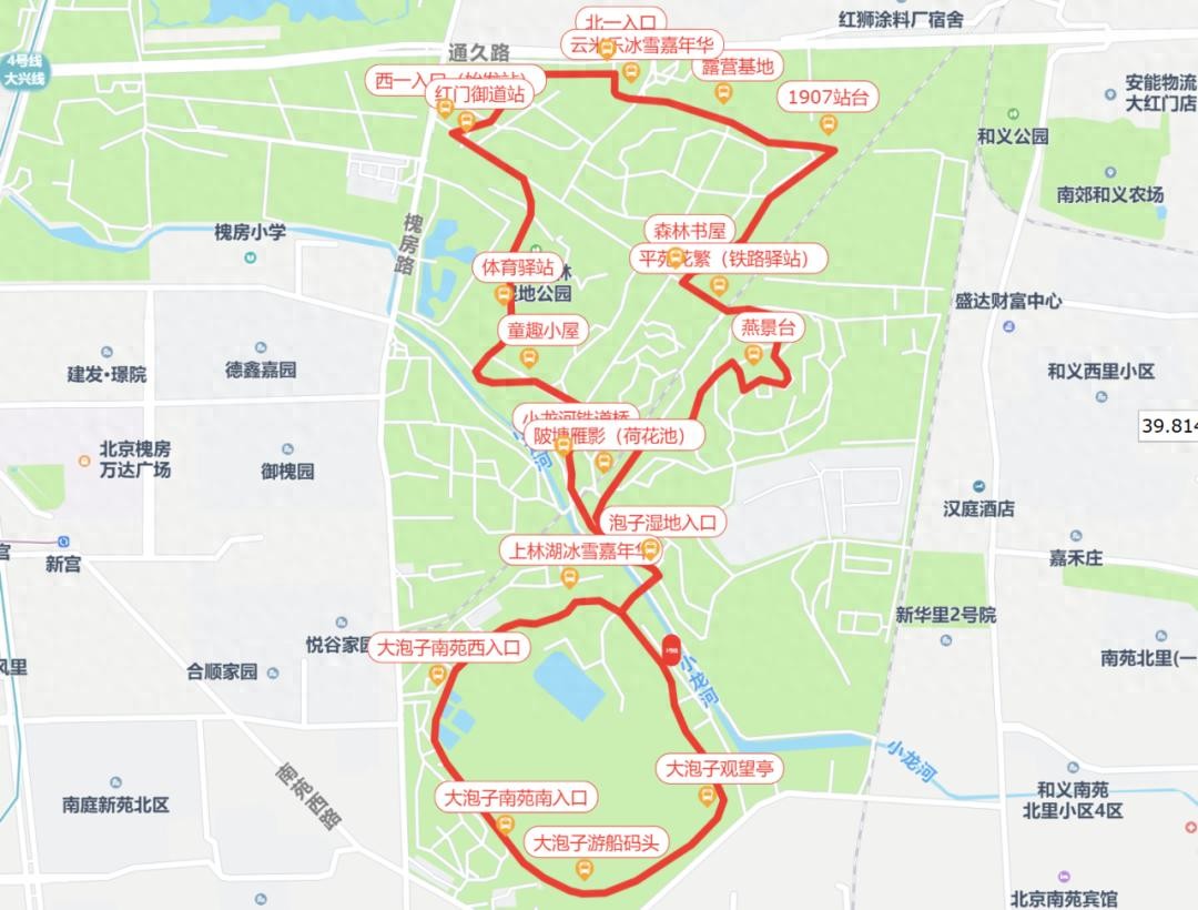 始发站:西一入口---->北一入口 ----> 云米乐冰雪嘉年华 ----> 露营基地 ----> 1907站台 ----> 森林书屋 ----> 平苑花繁(铁路驿站) ---->燕景台---->陂塘雁影(荷花池)----> 泡子湿地入口----> 上林湖冰雪嘉年华 ---->大泡子南苑西入口----> 大泡子南苑南入口 ----> 大泡子游船码头 ----> 大泡子观望亭 ----> 泡子湿地入口 ----> 小龙河铁道桥----> 童趣小屋 ----> 体育驿站 ----> 大红门御道 ---->西一入口(始发站)。