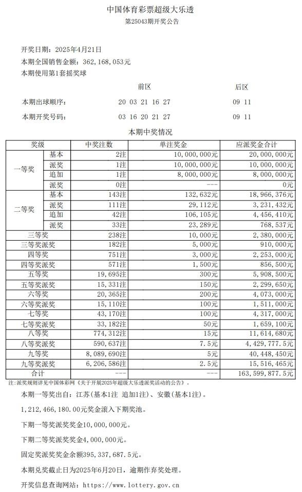 4月21日,超级大乐透第25043期开奖。前区开出号码03、16、20、21、27;后区开出号码09、11。本期全国销售3.62亿元,为国家筹集彩票公益金1.30亿元。