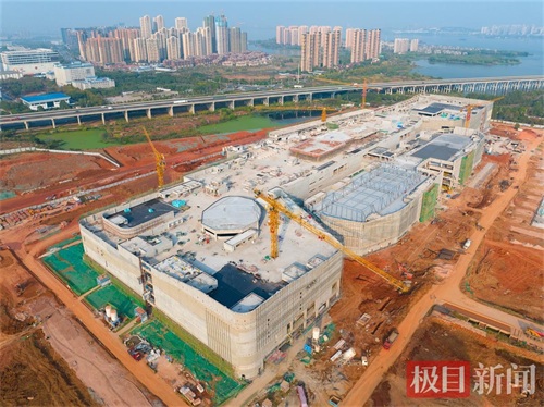 10月30日,位于江夏区文化大道与四环线交会处的永旺商业综合体项目已拔地而起。这一长达477米、宽度超144米的庞然大物已封顶,绿色安全网正在逐步拆除。施工人员正在进行外立面施工。