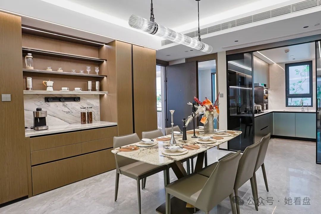约6.4米的客厅与餐厅等宽,搭配3.1米的层高,一整面的岩板电视背景墙,即使放70寸的电视机,视觉距离也足够了。