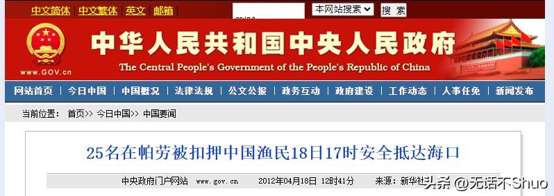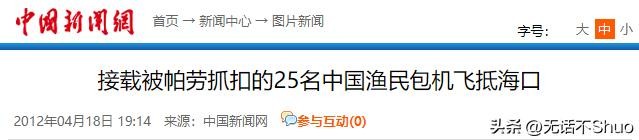 原文登载于2012年4月18日中国政府网关于25名在帕劳被扣押中国渔民18日17时安全抵达海口的报道