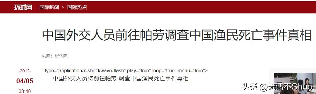 原文登载于2012年4月环球网关于中国外交人员前往帕劳调查中国渔民死亡事件真相的报道