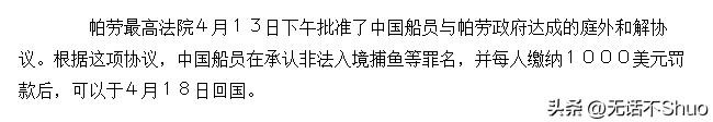 所以在经过一系列的调解下,2012年4月13日,帕劳的最高法庭批准中国渔民和帕劳签订的庭外和解协议,协议中,中国渔民承认了非法捕捞的罪名,并每人罚款1000元。
