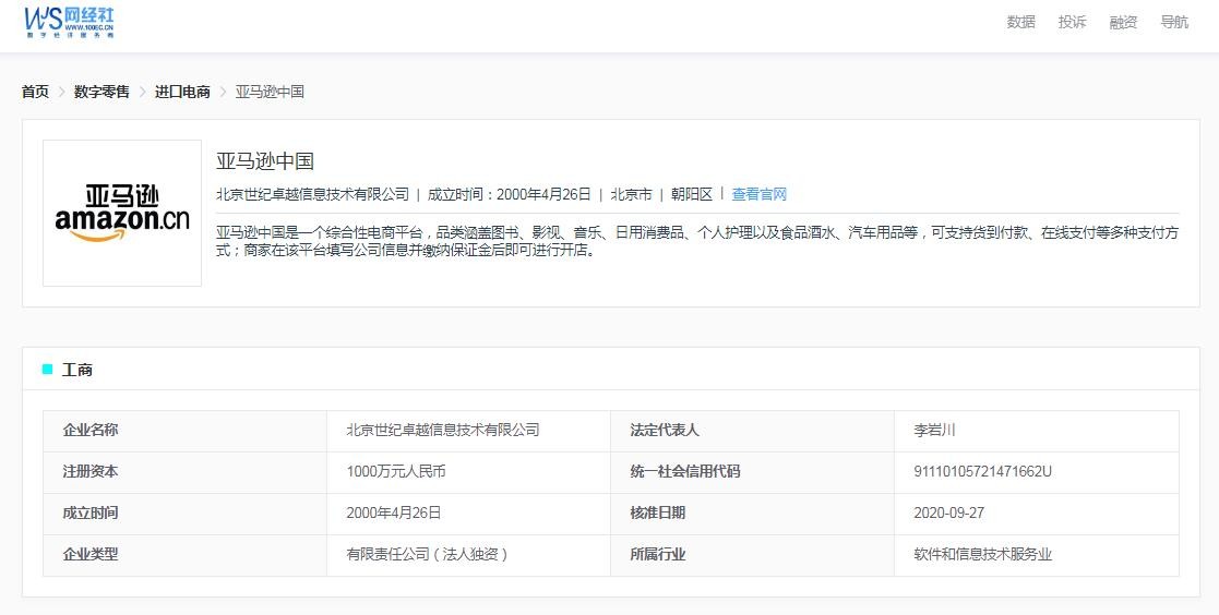据网经社企业库(COP.100EC.CN)显示,亚马逊中国隶属于北京世纪卓越信息技术有限公司,该公司成立于2000年4月26日,法定代表人是李岩川,公司位于北京市朝阳区,是一个综合性电商平台,品类涵盖图书、影视、音乐、日用消费品、个人护理以及食品酒水、汽车用品等,可支持货到付款、在线支付等多种支付方式;商家在该平台填写公司信息并缴纳保证金后即可进行开店。