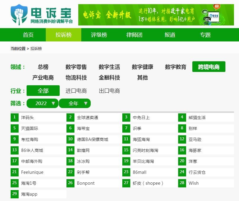 根据“电诉宝”2022全年受理的跨境电商领域用户有效投诉显示(依据投诉量排行),亚马逊排名第十二位,最新评级为“不建议下单”。其他被投诉的类似电商平台还有:洋码头、全球速卖通、中免日上、熊猫生活、天猫国际、海带宝、识季、别样、考拉海购、德国BA保镖商城、海狐海淘、86华人商城、敦煌网、闪亮时刻海淘、海豚家、中邮海外购、冰冰购、羊贝比海淘、洋葱、Feelunique、剁手帮、86mall、行云货仓、海淘1号、Bonpont、虾皮(shopee)、wish、海淘app。