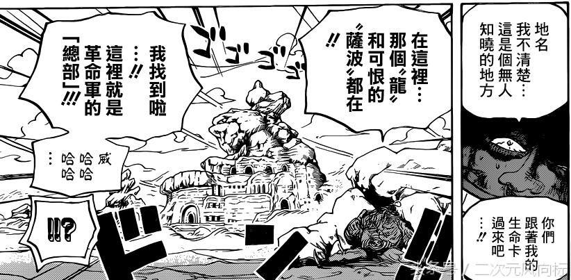 巴基斯和黑胡子海贼团已经知道龙的据点,以黑胡子的脑子,绝不会选择与龙硬碰硬,而是会选择把情报卖给世界政府,世界政府应该会以大将黄猿攻打革命军,如果海军采取速战的策略,藤虎也许会参与这次作战,不过期待已久的绿牛也可能出场。革命军的话,正好召集了各地领导人来开会,遇到大将自然不会硬钢,而会选择战略转移,不过还是无法避免作战,黑胡子可能也要插手捞一笔,龙应该会显示部分本领了。不过巴基斯歪打正着到了革命军基地为什么那么兴奋呢,会不会黑胡子的任务之一就是找革命军,那革命军中到底有什么呢,会不会是与青雉和黑胡子的交易有关,很可能的交易情况就是青雉与黑胡子联手抓住龙,逼问古代兵器的线索,而青雉要搞清楚恶魔果实的事!