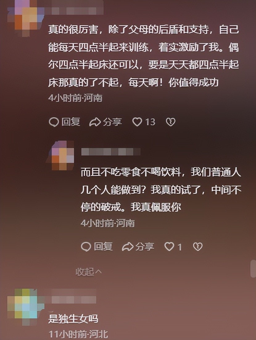 网友说:真的很厉害,除了父母的后盾和支持,自己能每天四点半起来训练,着实激励了我。偶尔四点半起床还可以,要是天天都四点半起床那真的了不起,每天啊!你值得成功!