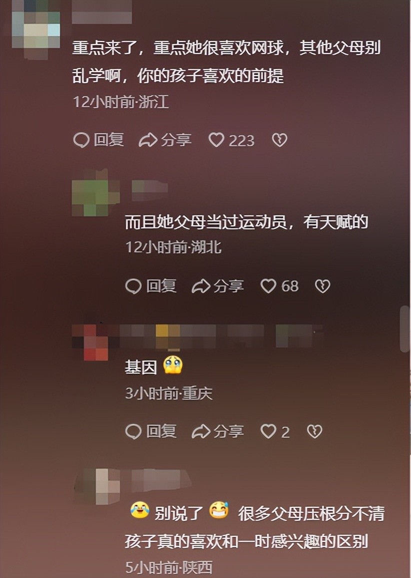 网友说:重点来了,重点她很喜欢网球,其他父母别乱学啊,你的孩子喜欢的前提!