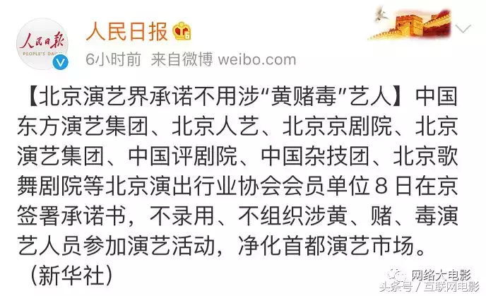 9月8日,北京人艺、北京京剧院、北京演艺集团等北京演出行业协会的多家会员单位签署了承诺书,承诺“不录用、不组织涉黄、赌、毒演艺人员参加演艺活动”,正式打响“净化演艺市场”第一枪!
