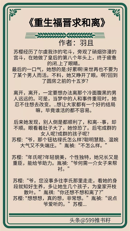 苏樱:“爷,您没事多往李氏那里走走,看她的身段就知好生养,多让她生几个孩子,为皇家开枝散叶。”胤祺:“你还想不想和离了?”