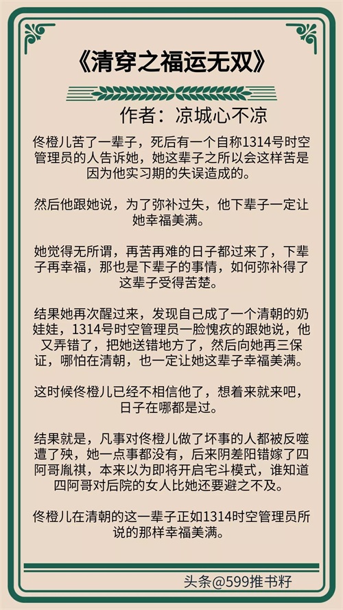 结果她再次醒过来,发现自己成了一个清朝的奶娃娃,1314号时空管理员一脸愧疚的跟她说,他又弄错了,把她送错地方了,然后向她再三保证,哪怕在清朝,也一定让她这辈子幸福美满。