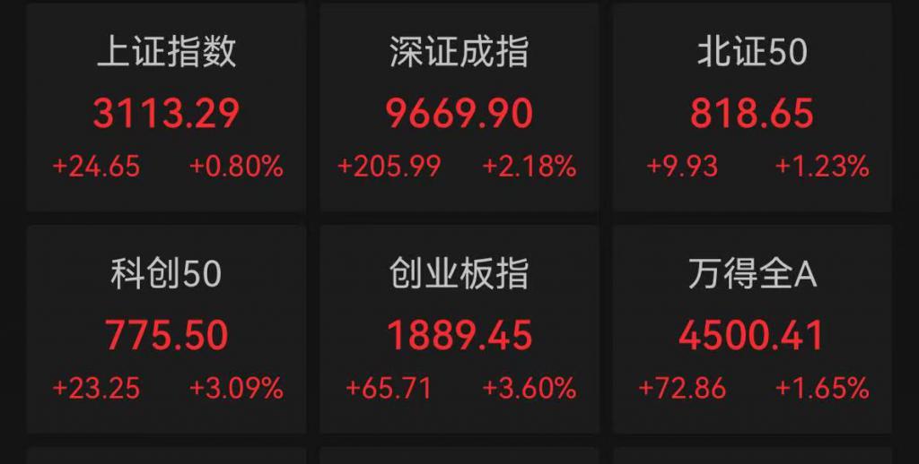截至午间收盘,上证指数涨 0.80%,报 3113.29 点;深证成指涨 2.18%,报 9669.90 点;创业板指涨 3.60%,报 1889.45 点。